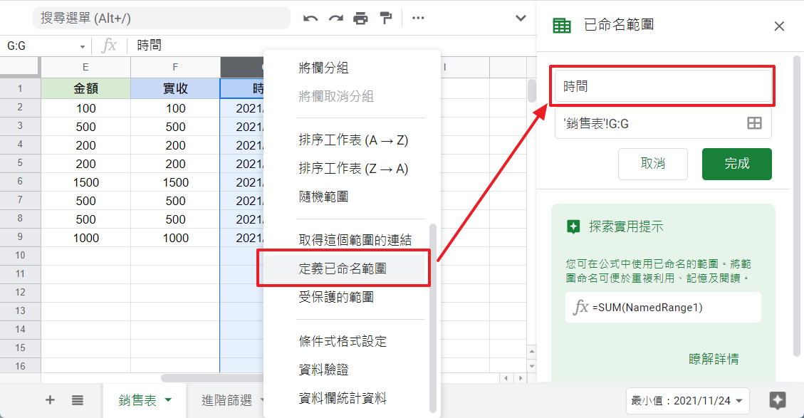 由於我們主要的條件是時間,所以要將時間那一欄選取起來,並將它命名。在這邊就把它命名成”時間”