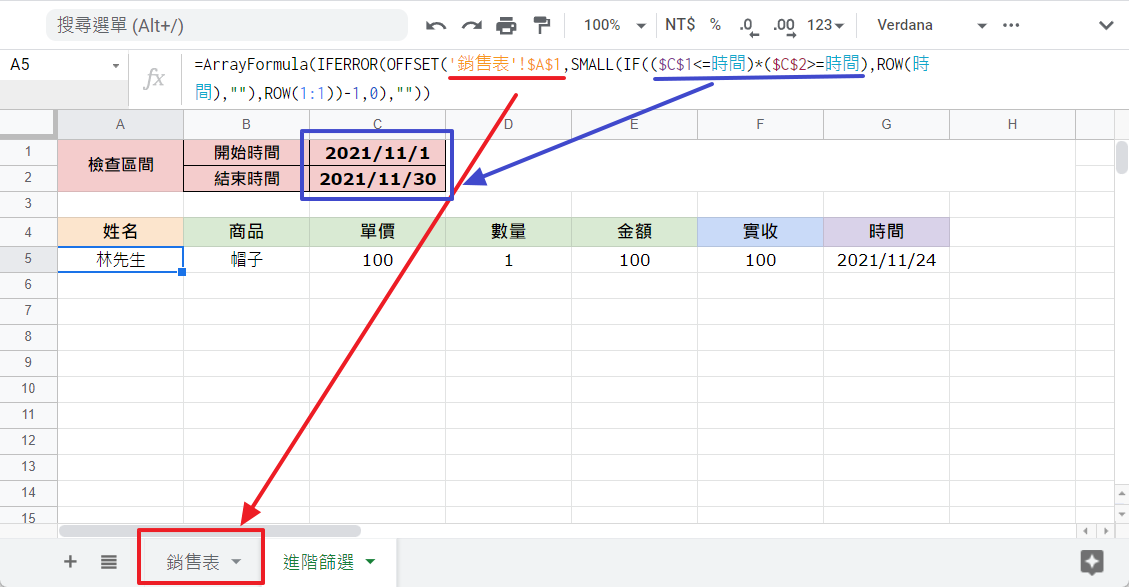 我來說明一下這個公式大致上的結構,詳細的單個函數使用方法還是要去網路上搜尋,比較可以知道詳細的使用方法。首先可以看到這是一個使用 ArrayFormula 以及 Offset 所組合的一個公式。而 OFFSET 主要是來指定銷售表中的 A1 欄,並且使用 IF 來篩選出我們要的時間區間的值。而這個公式裡面有一個重點是 ROW(1:1),當你要呈現下一筆資料時要改成 ROW(2:2) …以此類推。接著就利用 ArrayFormula 來呈現資料即可!