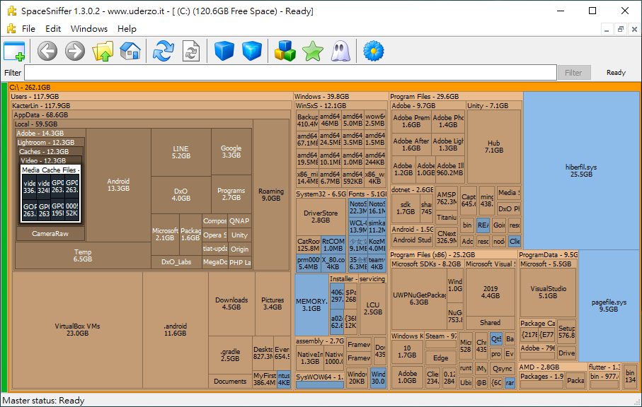 找出電腦硬碟中最佔空間的程式或檔案一直都是一大難題,尤其是積少成多的資料夾,讓你輕鬆的查看哪些是該刪除哪些是該留下更是不簡單。Space Sniffer 可以利用方格的區域大小讓使用者清楚的看到哪些檔案佔了比較大的空間,如果想要更進接的往下一個資料夾看下去的話直接點擊就可以用快速且明瞭的方式來找到最不需要的檔案唷!