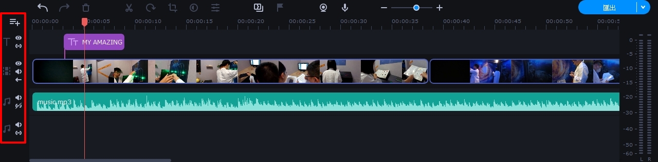 首先,先講解一下這套軟體上的時間軸。時間軸有分為三大軌道類型,由上而下為字幕、影片、音樂。字幕就是當你想要為影片上新增一段文字時,就可以將字幕新增到此時間軌道;影片就是你的影片素材;音樂也包含影片的音樂及配樂的音樂。你可以任意的放置你的素材到時間軸上,來搭配成你想要呈現影片的樣子。