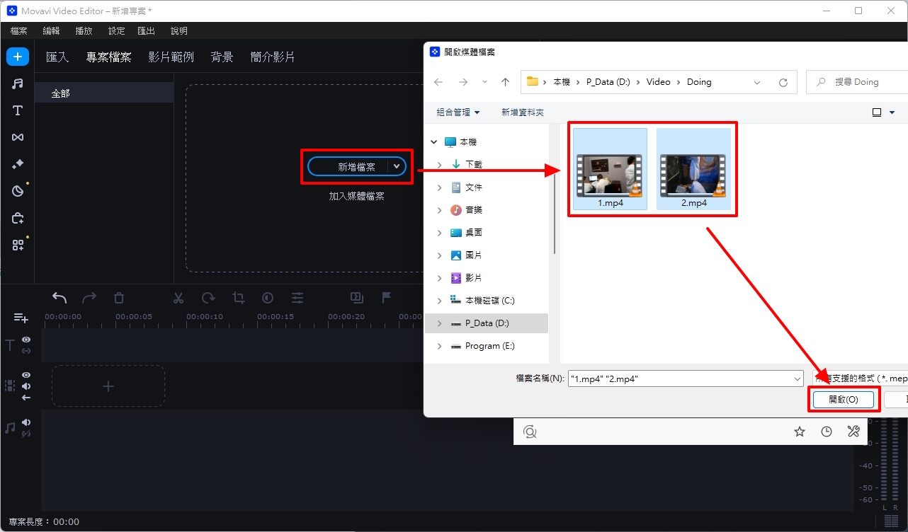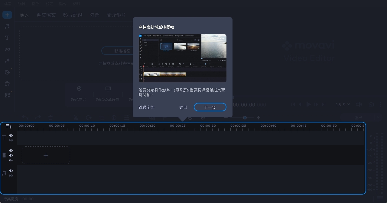 開啟軟體的第一件事,就是匯入你的素材。Movavi Video Editor 這套軟體要匯入素材很簡單,只需要點擊新增檔案或是拖曳檔案到程式裡面即可。