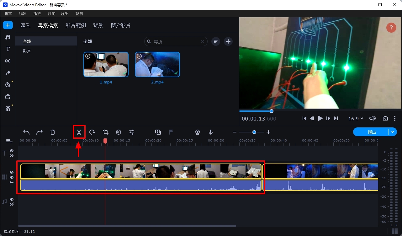 在 Movavi Video Editor 上剪輯影片相當簡單,首先需要素材新增到時間軸上,然後選取你要剪輯的片段,就可以發現上面的編輯工具列的剪刀呈現成可以點擊的樣子,點擊剪刀即可將片段一分為二了。