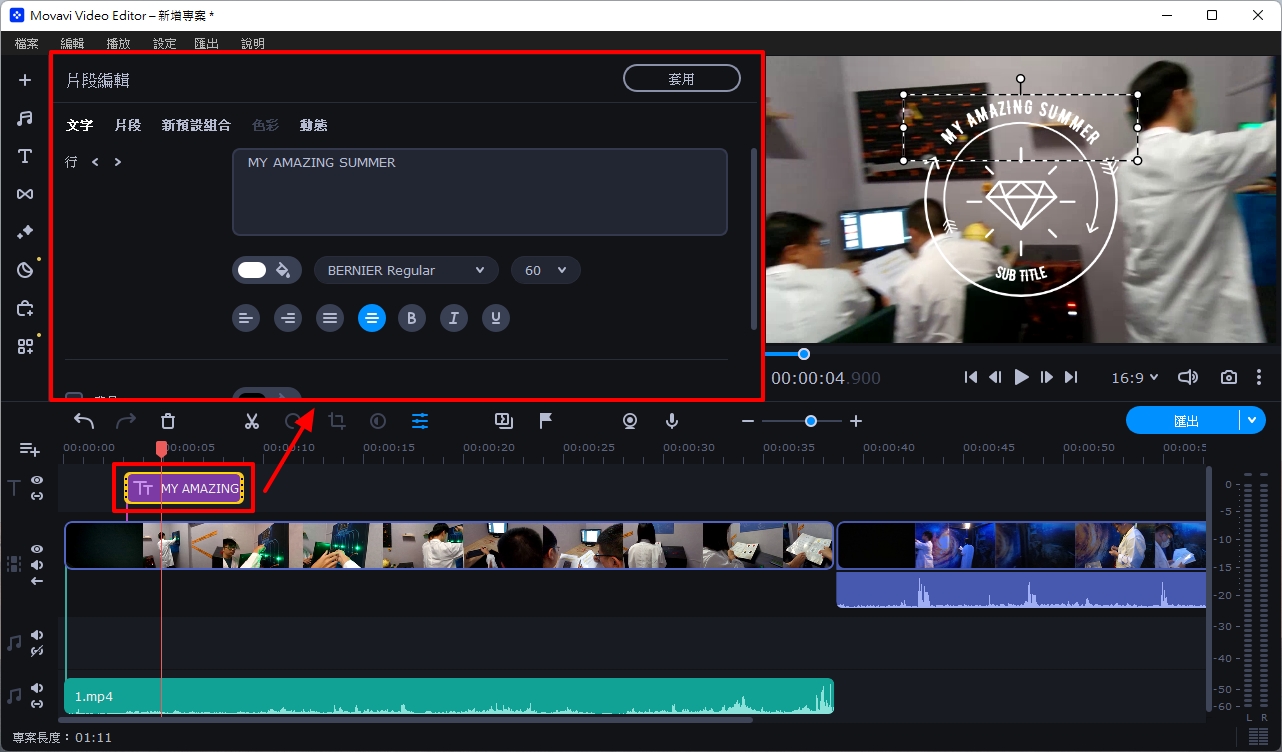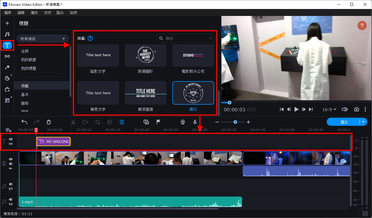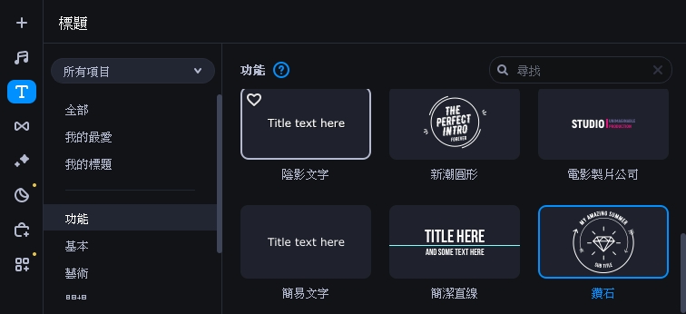 如果你對於字幕排版或設計不是那麼在行的話,Movavi Video Editor 內部已經有多種樣版可供使用,各個都相當有設計感,可以增加你整體影片的質感。只需要挑選想要的字幕拉入時間軸中,再選取剛剛拉進去的字幕後,就可以更改成屬於自己的字幕囉!
