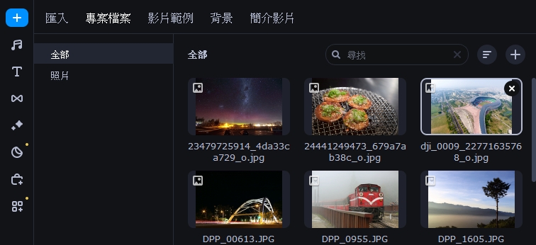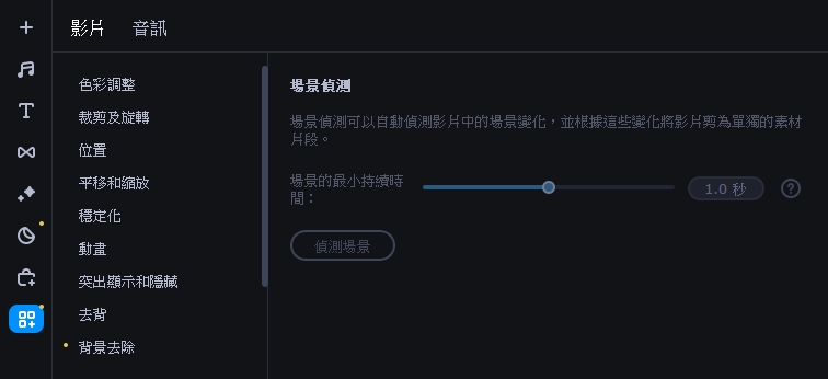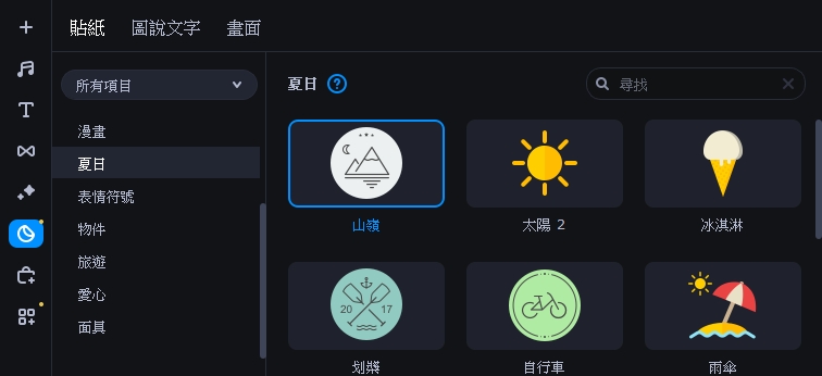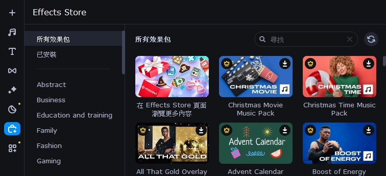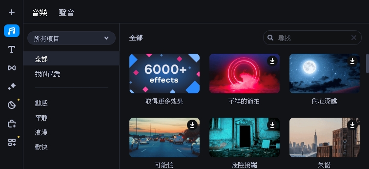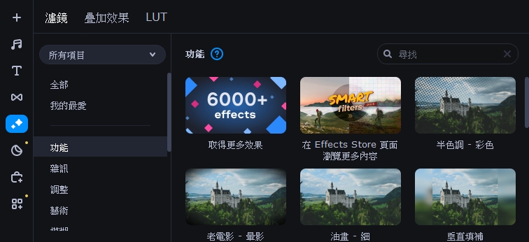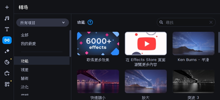 Movavi Video Editor 基本上把所有功能都分到左上方的區塊中,共有八個區塊: