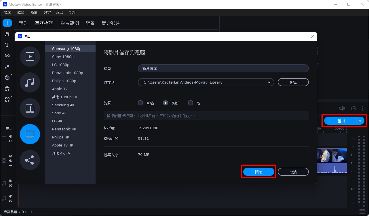 當你前面完成了你的剪輯之後,接著就要將影片輸出成影片檔。在介面的左方就有一個匯出的按鈕,點擊下去後就會跳出匯出的相關設定視窗。接著設定好要匯出的參數後就可以直接匯出影片。而程式也有預設幾個常見的設備輸出設定值,方便不懂如何設定參數的初學者,一點擊即可成功匯出。