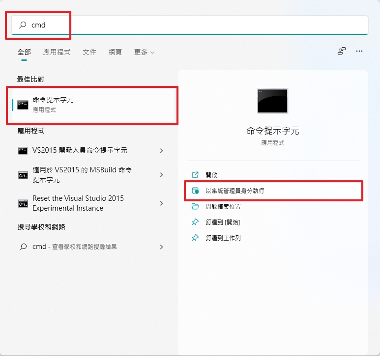 由於我們要先知道使用者名稱在登錄檔的 SID 是多少,所以需要進入到命令提示字元來查詢,並且要以系統管理員身份執行命令提示字元。