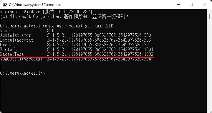 輸入下面的指令,即可看到結果。這一次要示範的帳號是「KacterTest」這個帳號,所以可以看到他的 SID 是 「 S-1-5-21-1178197055-888323762-3542977526-1002」這一串 SID 要先記錄下來,等等更改登錄檔時會使用到。