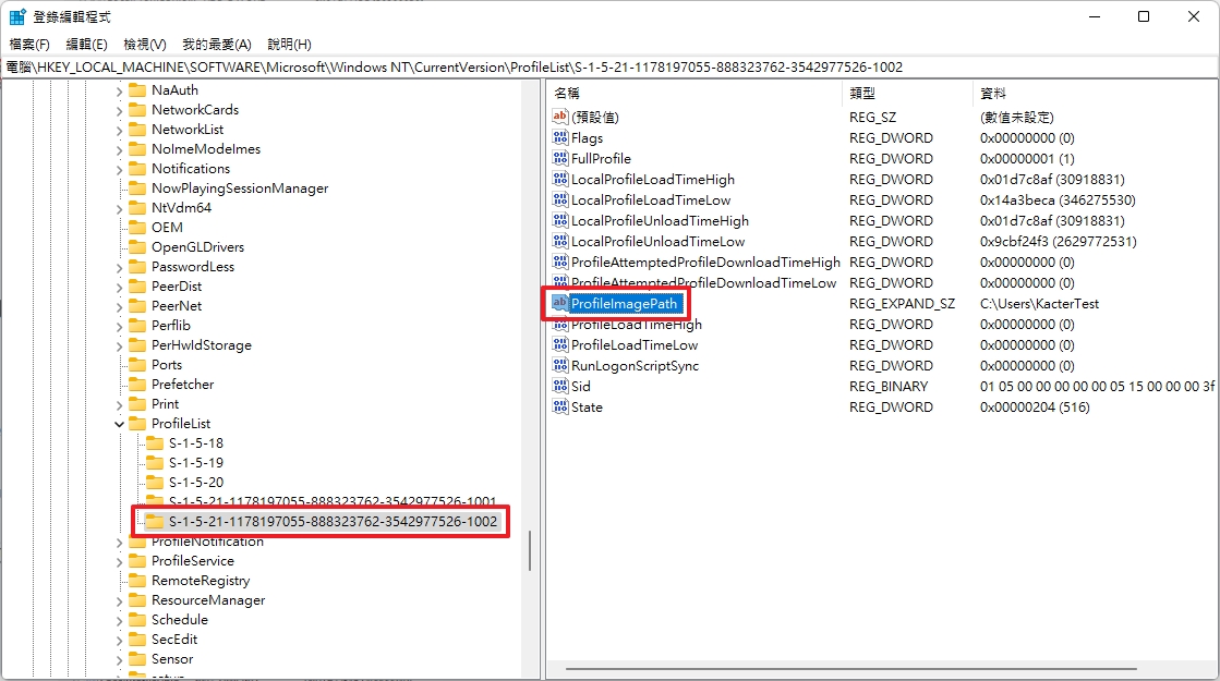 在 ProfileList 資料夾底下尋找剛剛找的 SID 的資料夾。點開後可以在裡面找到「ProfileImagePath」這個機碼