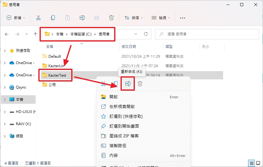 Windows 不允許更改自己的使用者名稱資料夾。需要登出後,再利用另一個管理員帳號登入,才可以更改別人的使用者資料夾名稱。