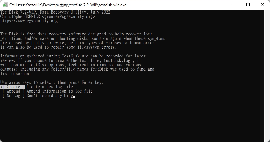下載好軟體後,可以找到 testdisk_win.exe 這個檔案,將它開啟。第一步直接選擇 Create