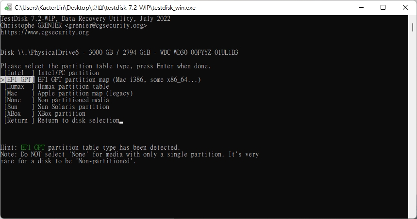 接著選擇正確磁碟分割表格式,由於我的硬碟是放在 Linux Nas 上時損毀的,所以這邊我選擇 EFI GPT。如果一般的 Windows 可以選擇 Intel,不是很確定的話可以先選擇一個,後面選擇檔案的時候如果沒有正確的顯示檔案列表時再回來選擇其他格式即可。