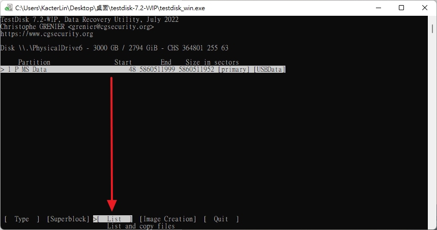 當有出現下方 List 的選項時就代表剛剛選擇格式的時候是選擇正確的。接著就選擇你要救援的磁碟分區,按下 List
