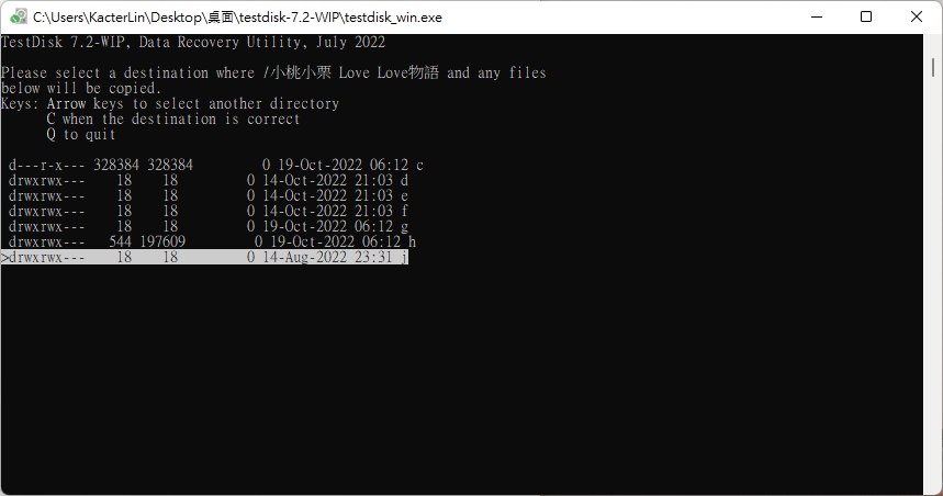 上一步選擇檔案後按 C 或是 c 接著就會讓你選擇你要複製的目的地。這邊的資料夾結構就是你電腦的資料夾,選擇方式跟上面的快捷鍵一樣,選擇好目的地之後就可以按 C 開始將檔案複製出來囉!