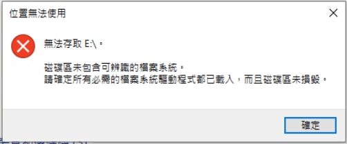 日前我的 NAS 外接硬碟突然發生無法讀取的問題。我立刻將外接硬碟拿到桌機上讀取。結果就出現以下的訊息視窗。寫到「無法存取,磁碟區未包含可辨識的檔案系統,請確定所有必須的檔案系統驅動程式都已載入,而且磁碟區未損毀。」簡單來說有可能硬碟的格式已經跑掉了(也可以說 RAW 格式),導致無法讀取硬碟裡面的資料。當你用 chkdisk 指令時也會發生無法操作的狀況。