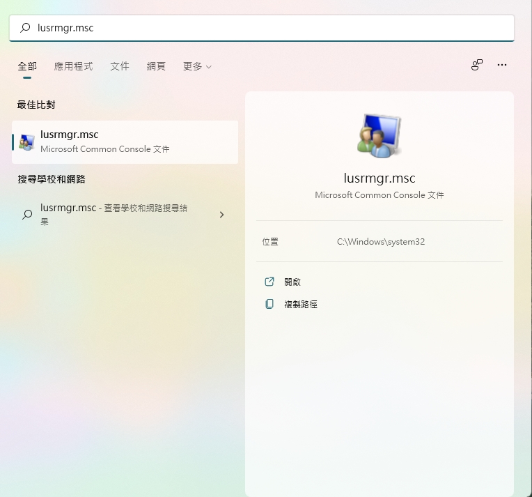 首先,在開始畫面或是搜尋頁面亦或者直接 Win+R 中輸入 lusrmgr.msc,開啟使用者管理頁面
