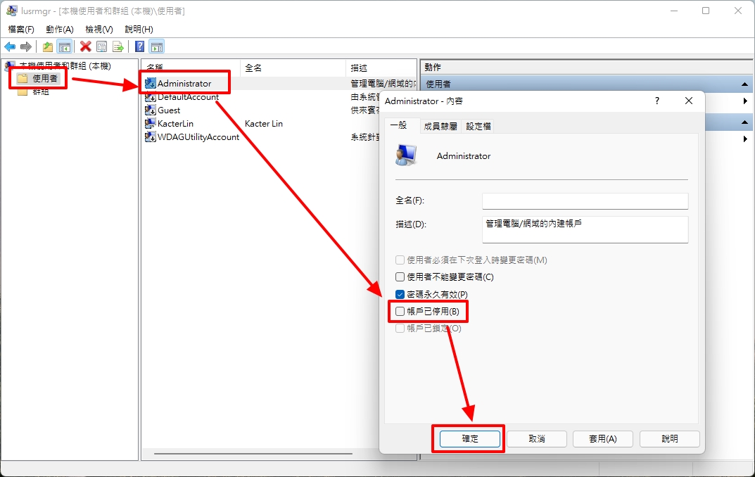 本機使用者和群組 -> 使用者 -> Administrator 雙擊點開管理員帳號。直接將帳戶已停用的選項取消,點擊確認後,就可以登出看看有沒有多一個 Administrator 的帳號可以使用。